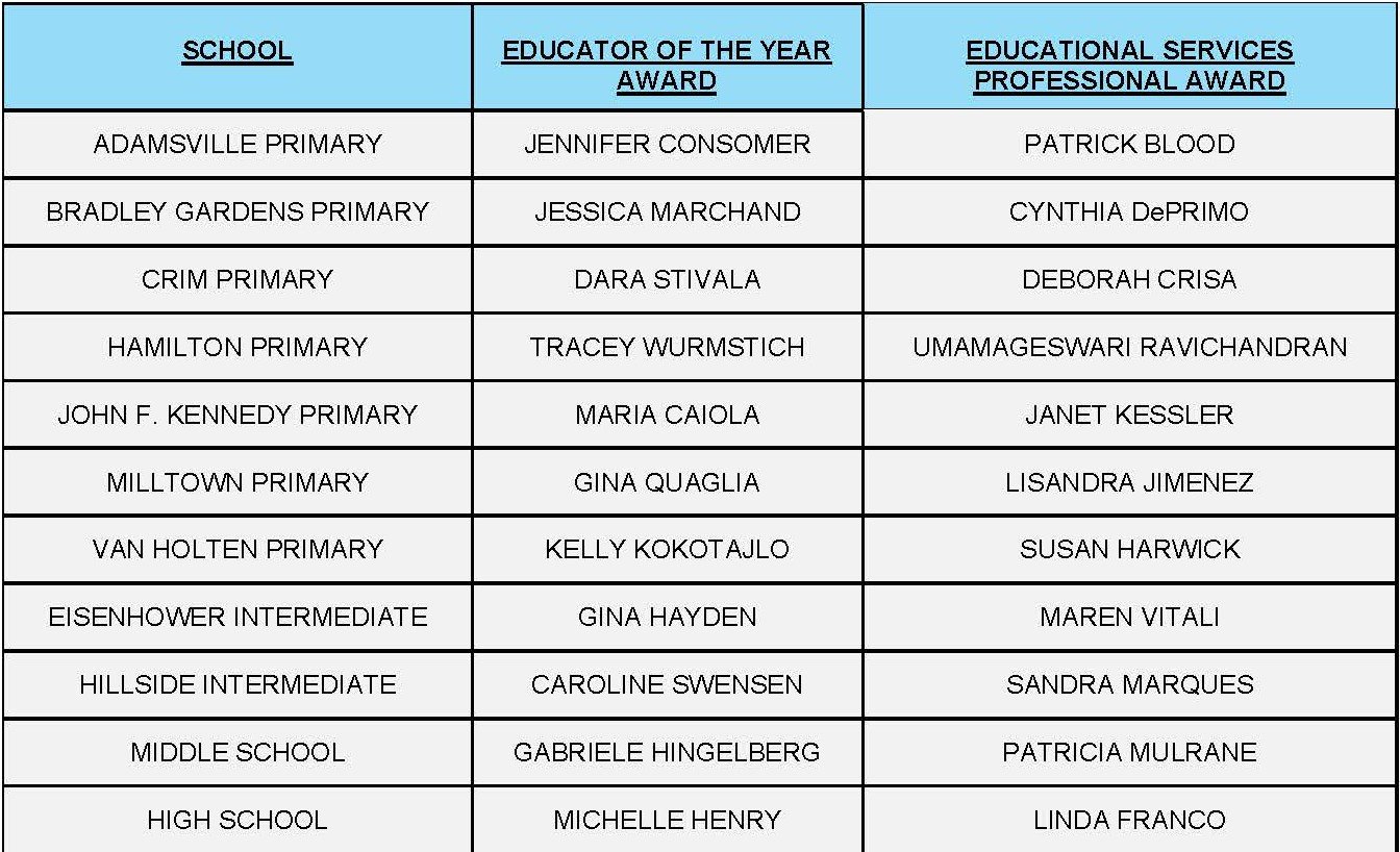 The following Bridgewater-Raritan Regional School District staff members have been selected as their school’s 2025-2026 Governor’s Educator of the Year Award and Educational Services Professional Award recipients. Congratulations to all of the honorees! |